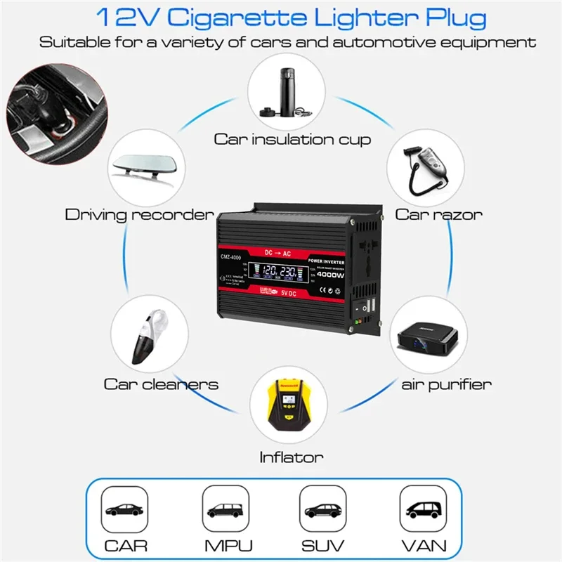 * 4000W vehicle power inverter, convert DC 12V to AC 110V/220V, the output voltage is constant and accurate.