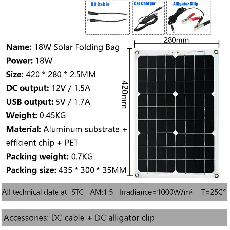 1 x Solar Panel 18W 18V+DC cable + DC alligator clip