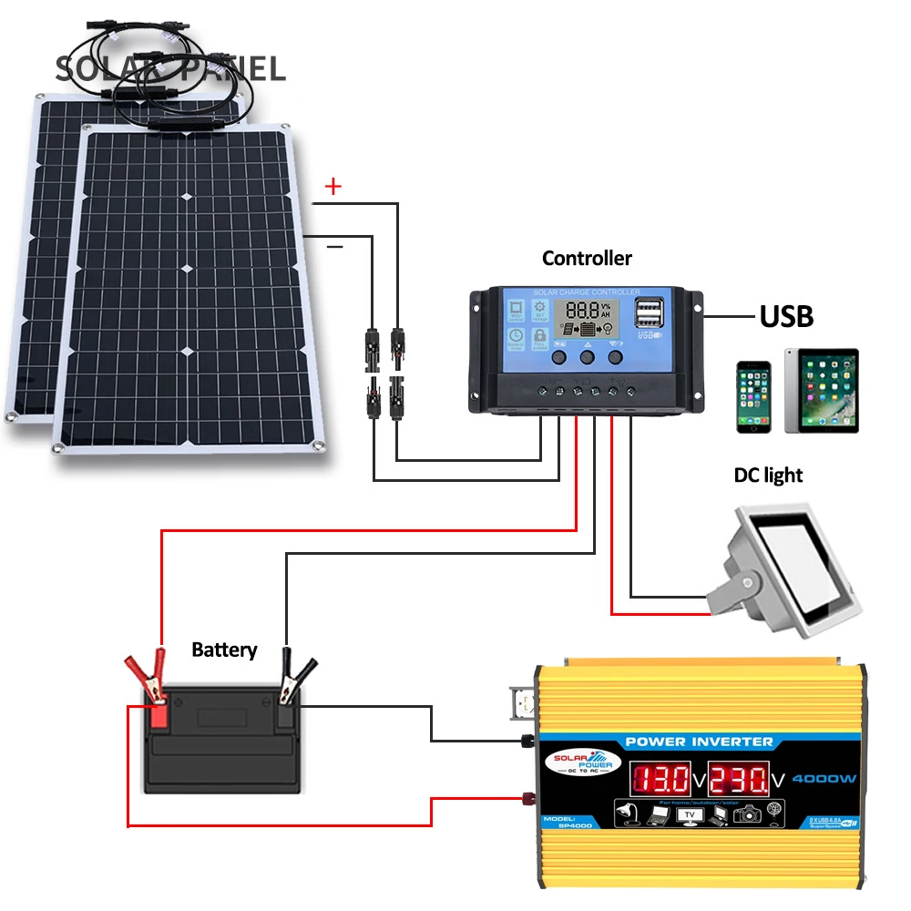 solar panel (to receive solar energy to charge the battery)+Inverter (to convert 12V DC power of the battery into 220V or 110V AC power)+solar controller (to control battery charging and discharging)+battery (energy storage) (provided by the customer)