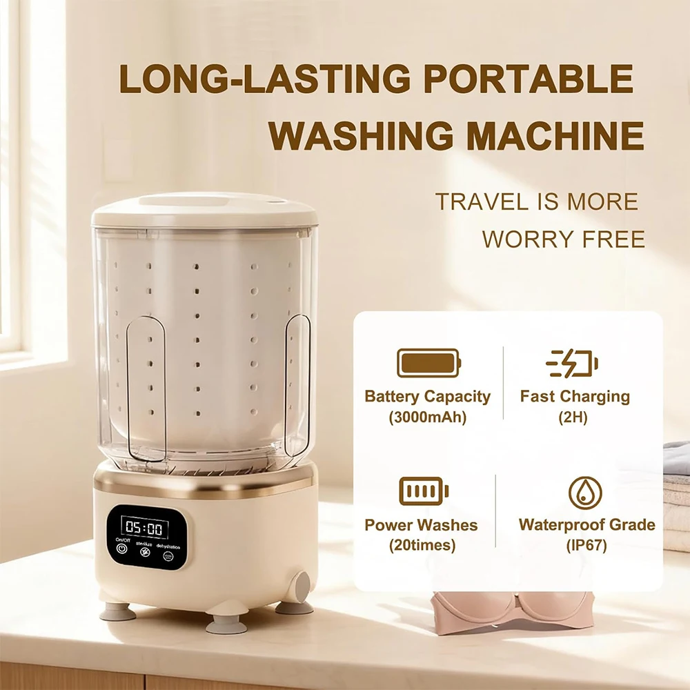Portable laundry machine built-in 3000mAh battery supports about 10–12 washes or 12–15 spins. No power outlet needed, lightweight and easy to store, ideal for camping, business trips, dorms, apartments, or RVs.