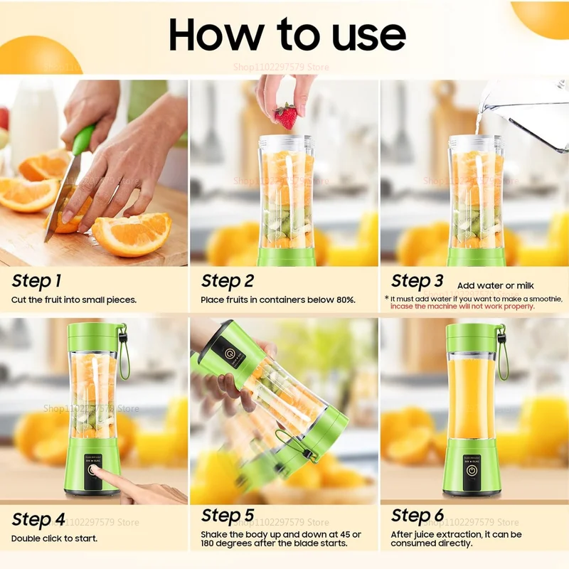 【Easy to use】 Please add water and small pieces of fruit, pick up the cup of the pulp separated from the blade, click the switch to start, turn on the machine and shake the body left and right.