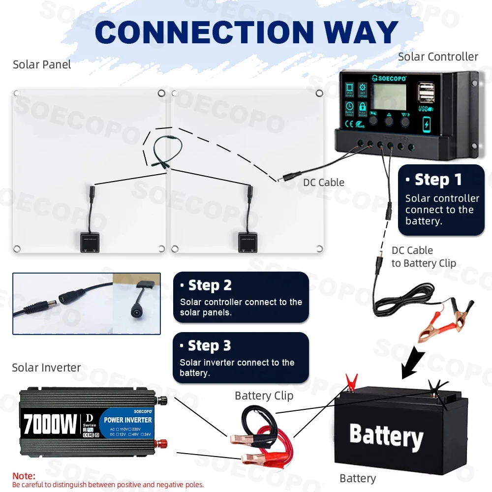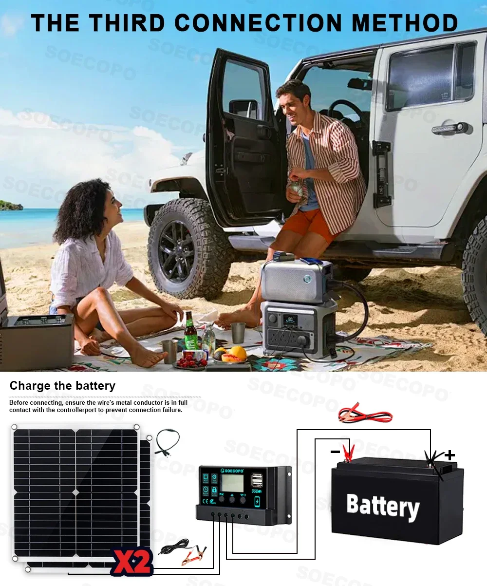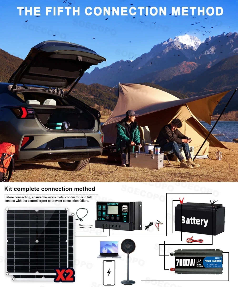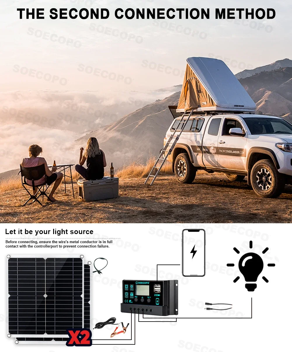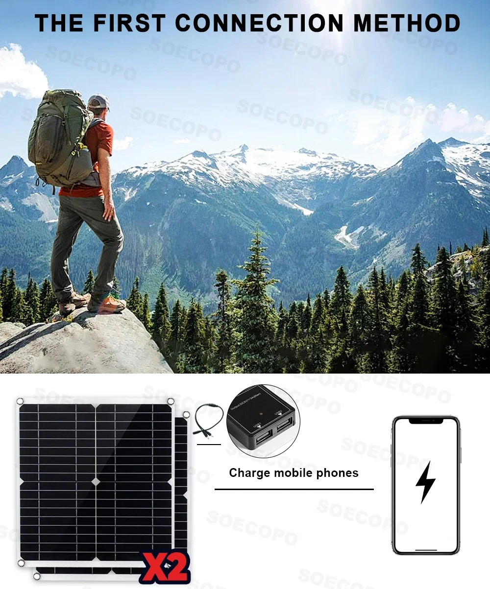 Whether it's single person hiking that pursues lightweight travel or home camping that requires a rich electricity experience, the SOECOPO solar power generation kit can be precisely adapted. From core components to connectivity gameplay, we provide comprehensive coverage of outdoor electricity needs, ensuring that every outdoor exploration is fully charged and exciting, doubling the power supply (Note: The set does not include a battery, you need to match it with your own battery.)❗