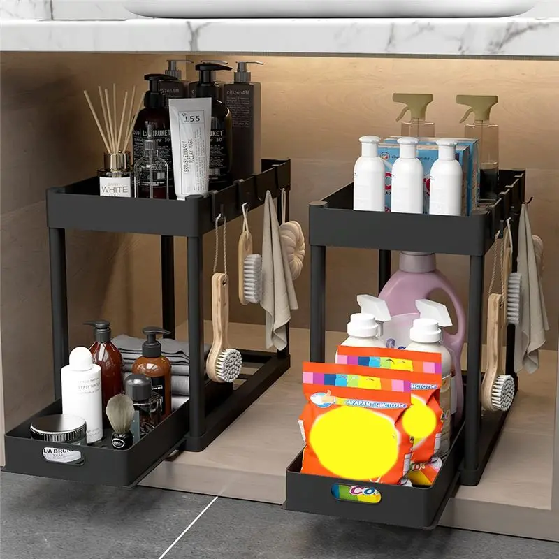 Maximized Space Utilization: Featuring two storage tiers with sliding drawers, this organizer allows for easy access to detergents and condiments. It eliminates the need to bend over, saving space and maintaining organization in any room.