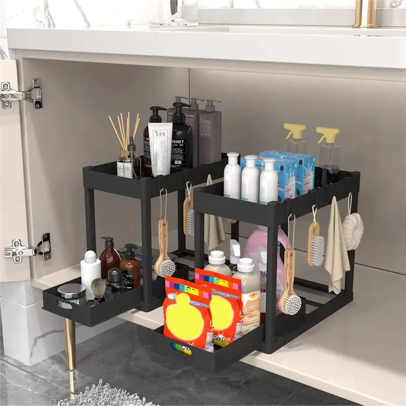 High-Quality Construction: Crafted from eco-friendly materials with a frosted matte finish, this under sink organizer is designed to resist rust and bear significant weight without compromising on aesthetics or functionality.