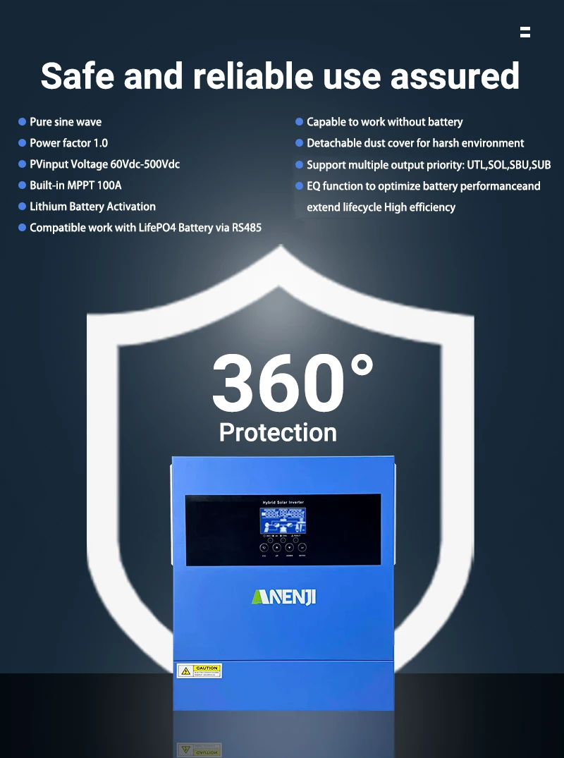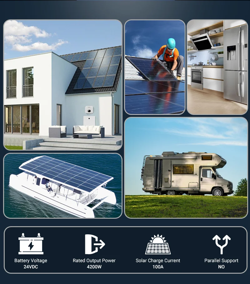 10. Battery Optimization Function (EQ): Enhances battery performance and extends battery lifecycle.4200W 24V Hybrid Solar Inverter