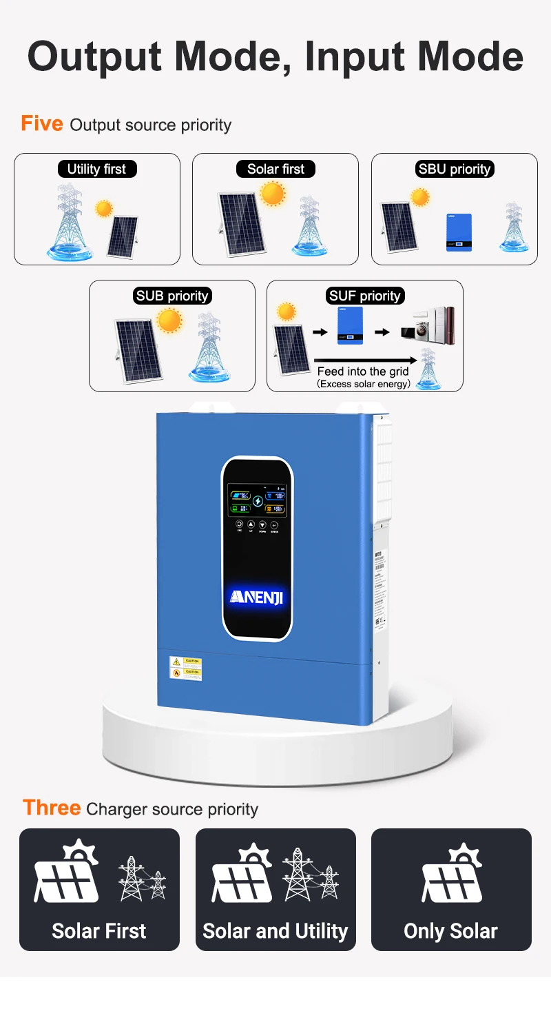7. Supports Multiple Output Priorities: Configurable output priority settings including UTL, SOL, SBU, and SUB for flexible power management.