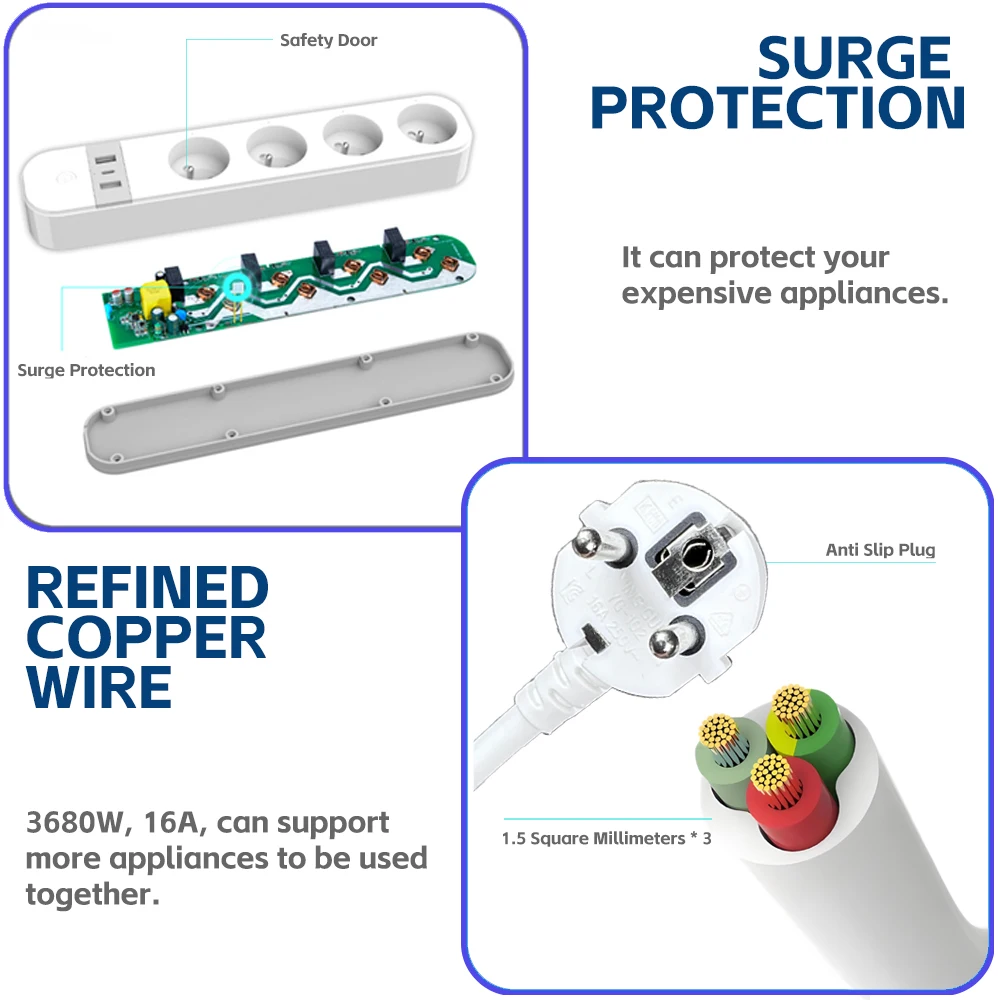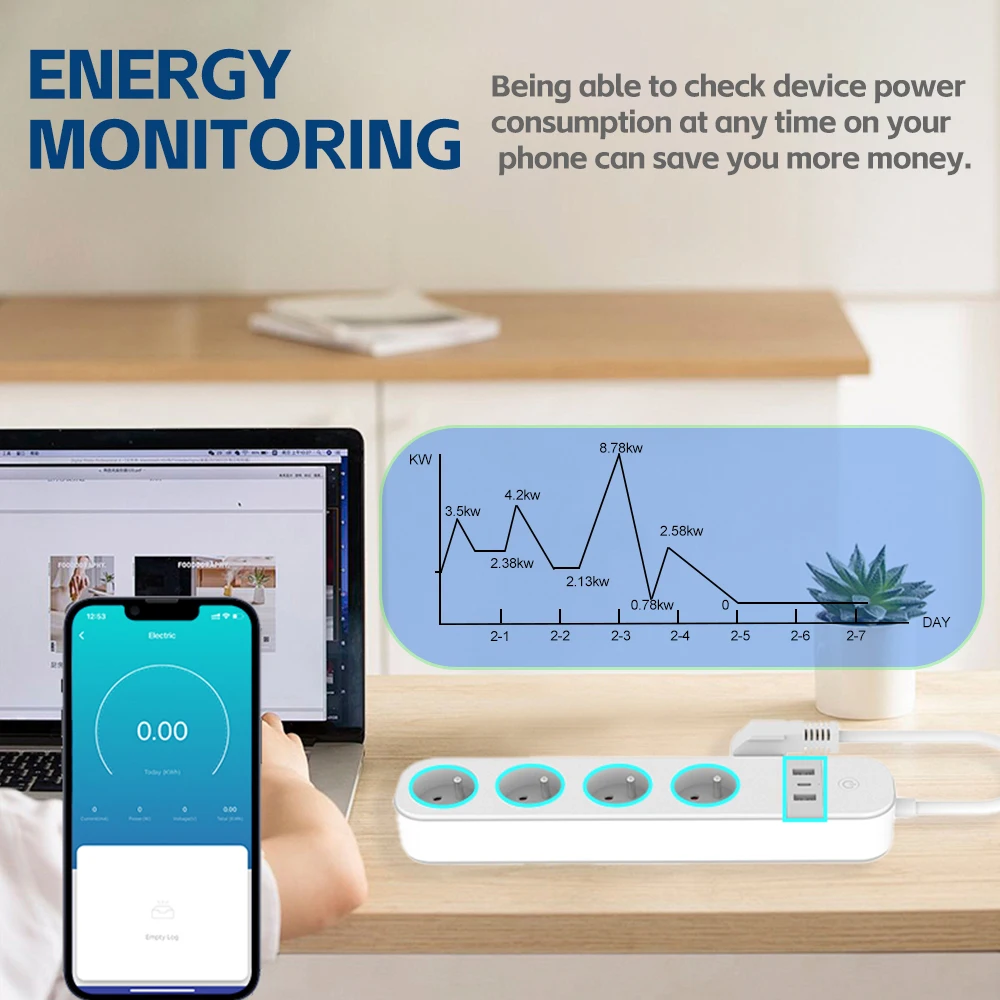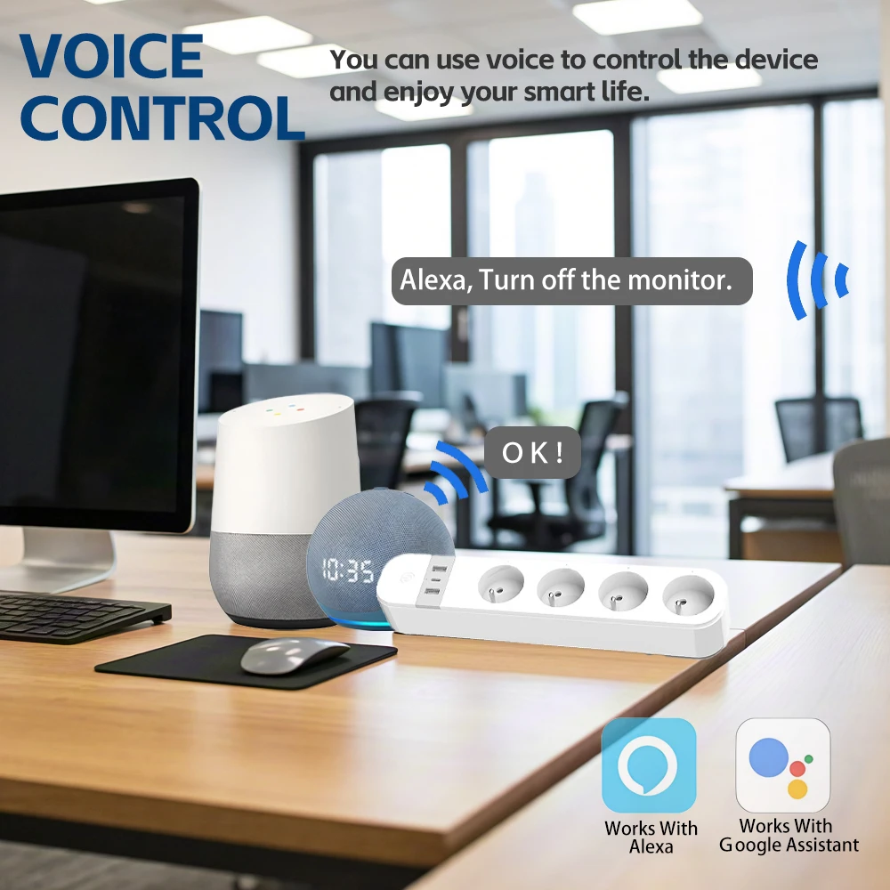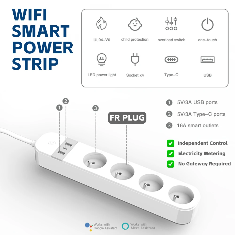 1. This FR plug's WiFi smart power strip has 2 USBs and 1 Type-C integrated control, and 3 AC sockets can be independently controlled. Multiple output ports meet the needs of multiple devices, and energy monitoring or device control can be achieved through Smart Life or Tuya Smart applications, saving money.