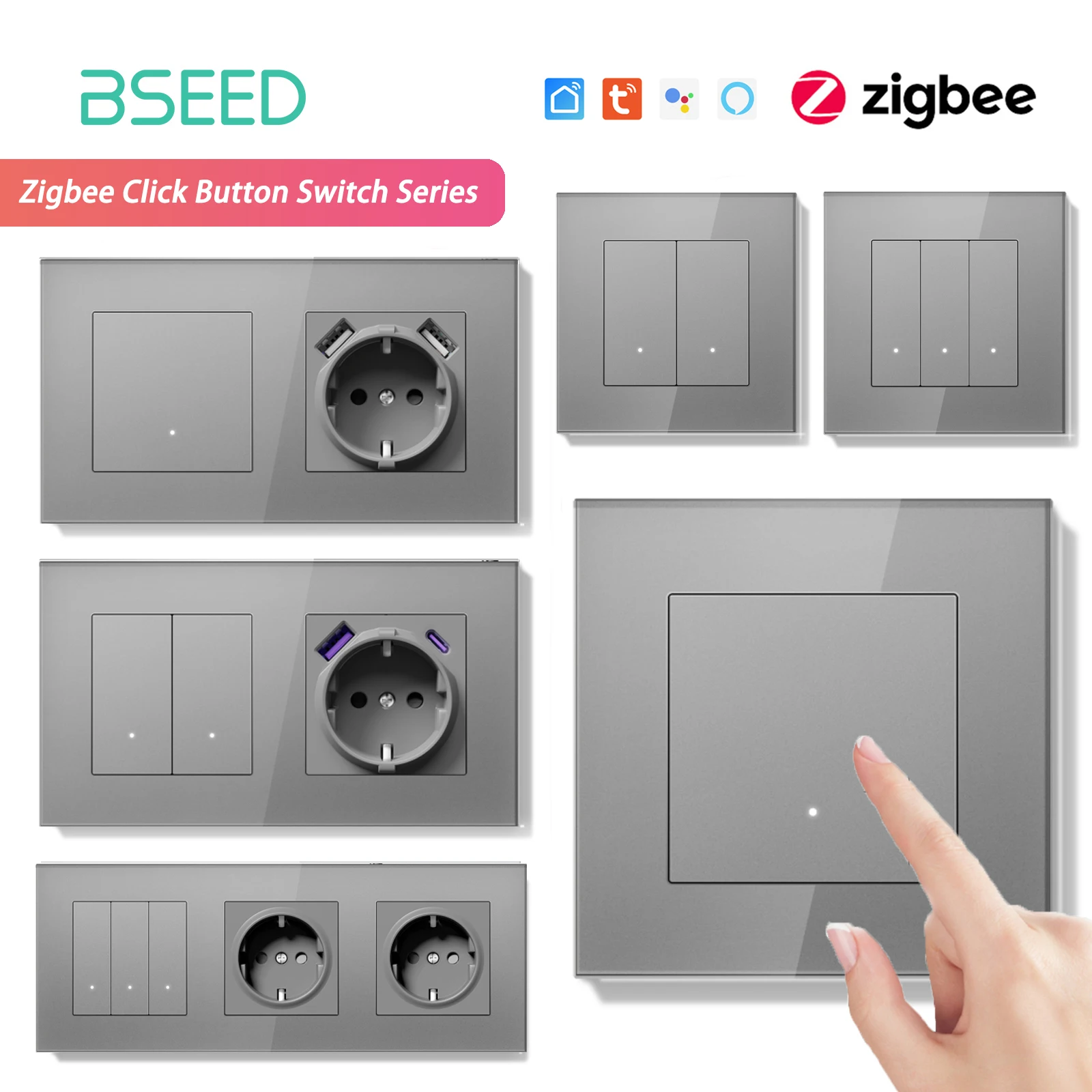 BSEED 1/2/3/4Gang Zigbee Smart Click Button Switch With EU Socket Glass Panel White LED Indicator Tuya Smart Life Alexa Control