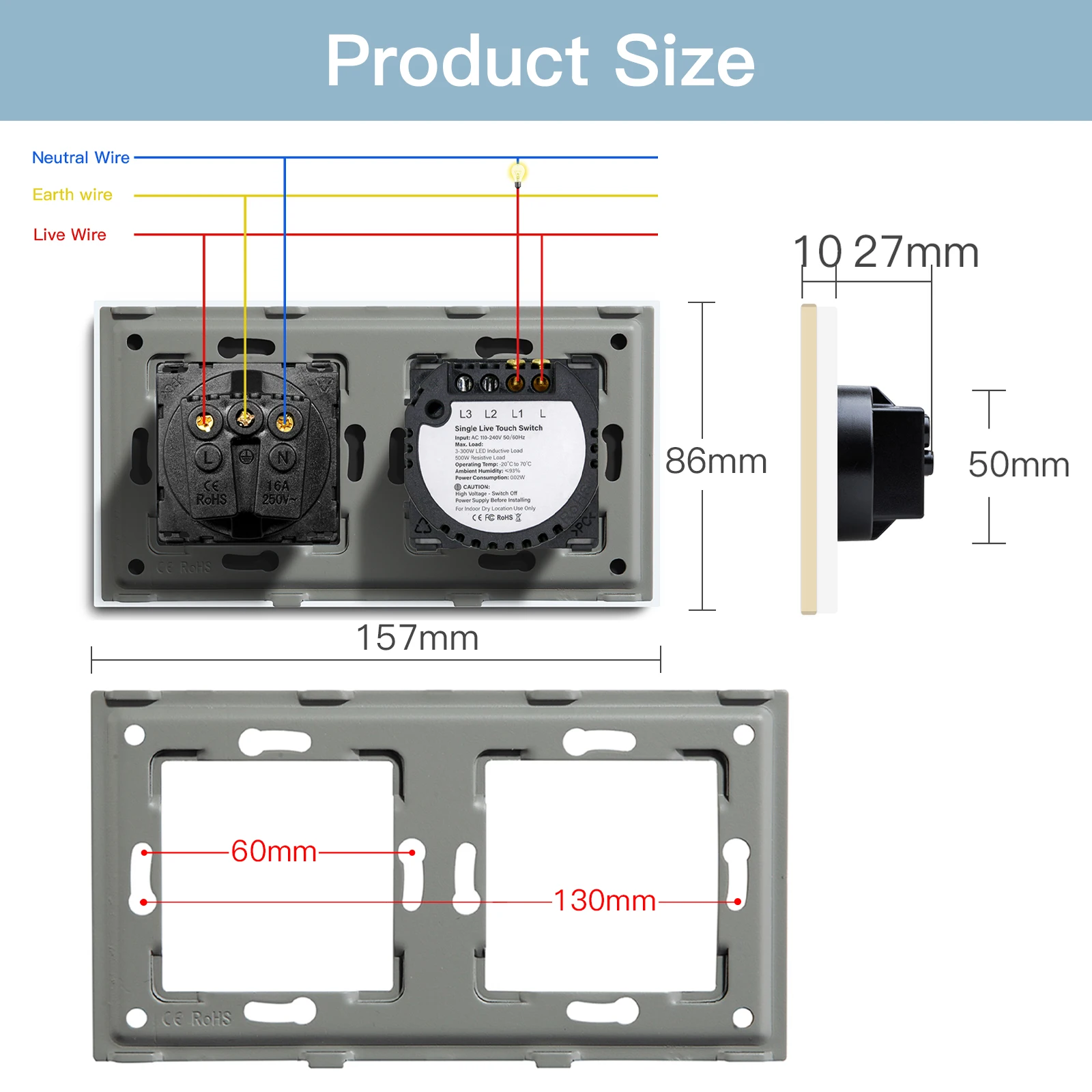 - Material: Glass Panel / Iron Plate / Plastic Switch Module