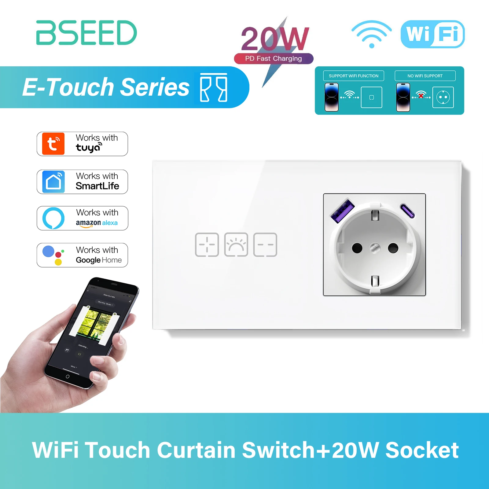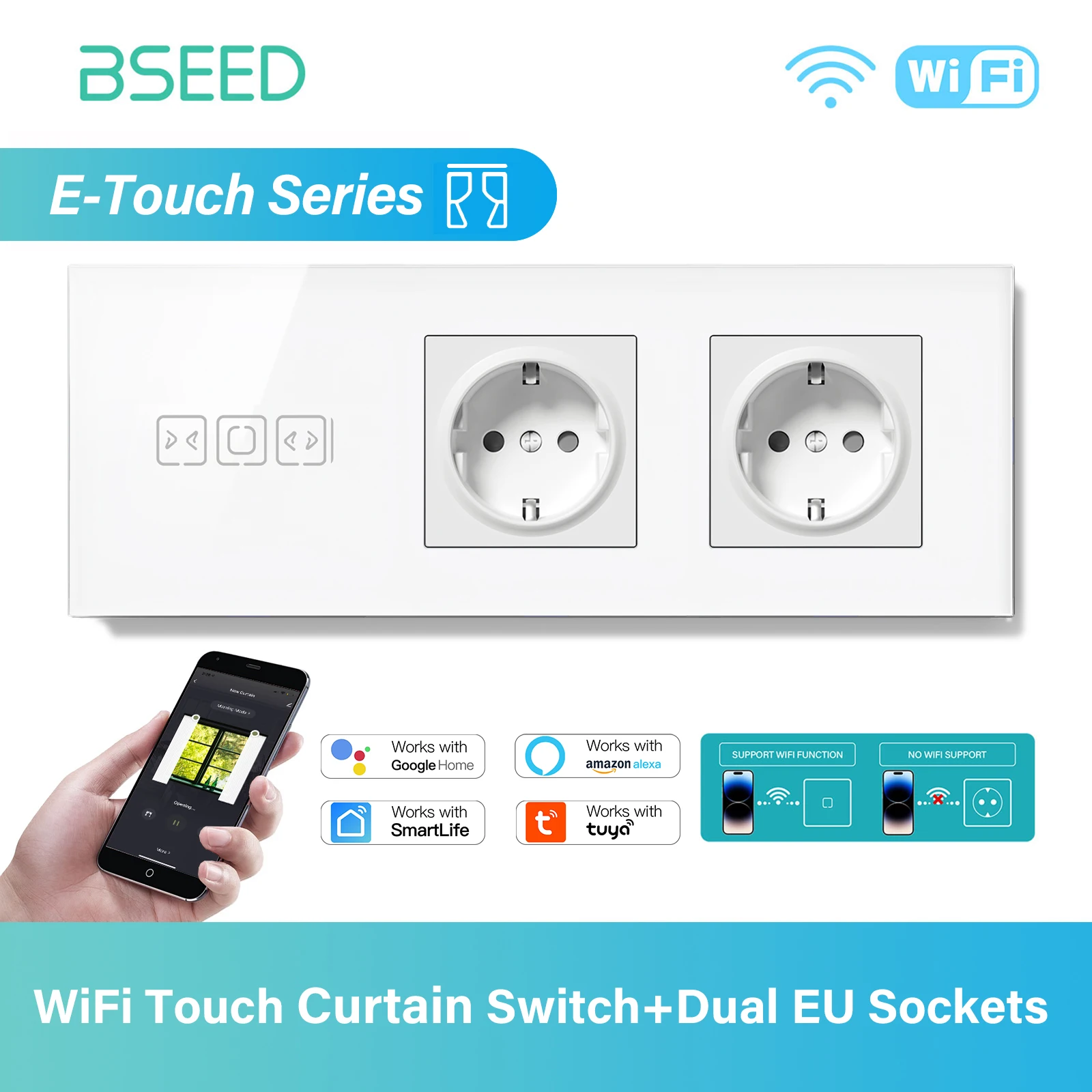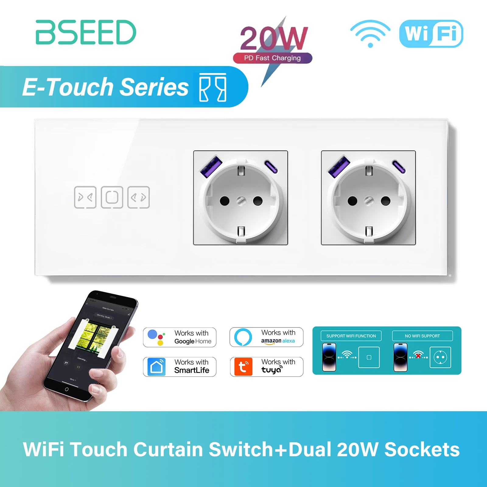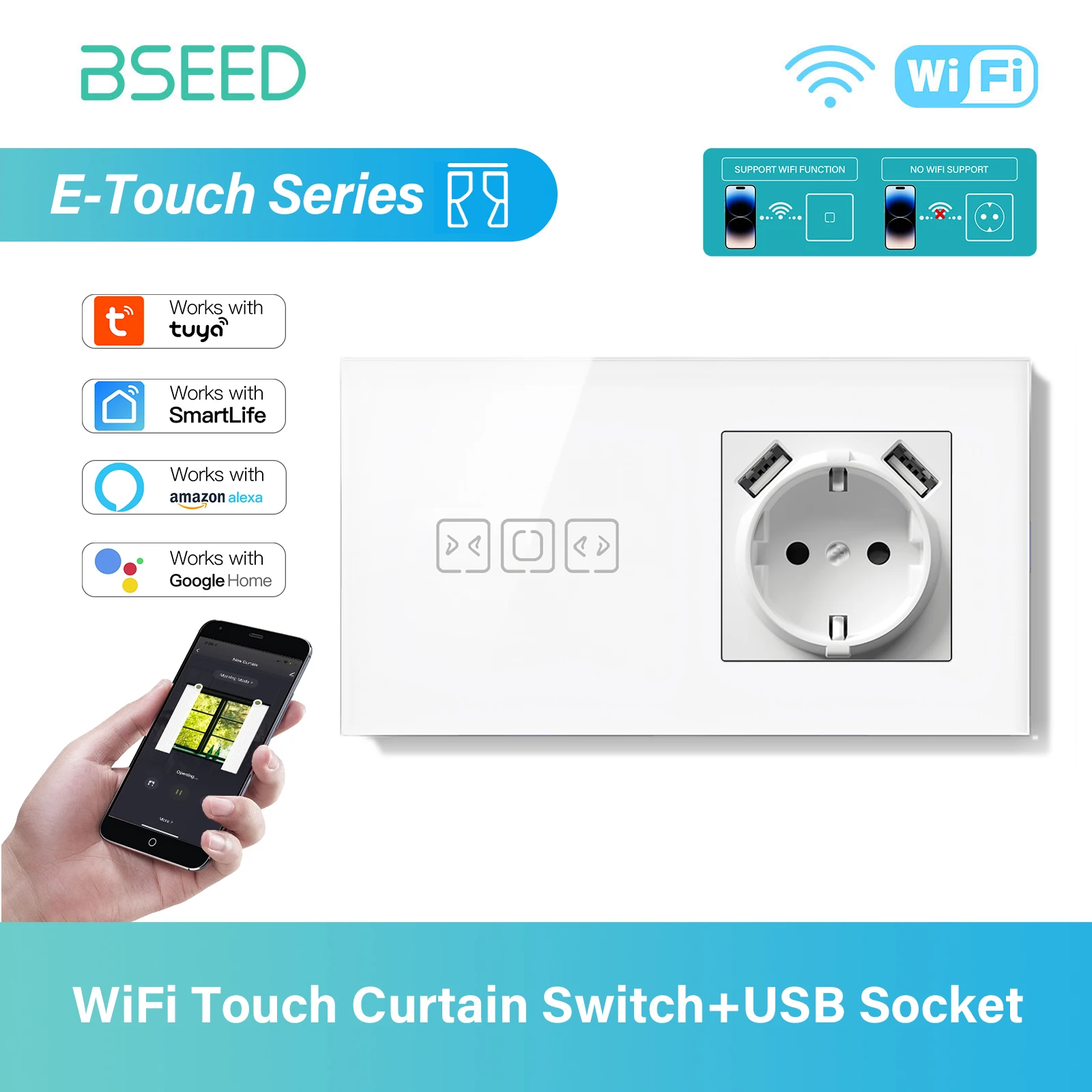 BSEED WIFI Curtain Switch Series Wall Smart Click Switches Yellow Backlight Glass Frame Tuya APP Switch EU Wall Sockets with USB