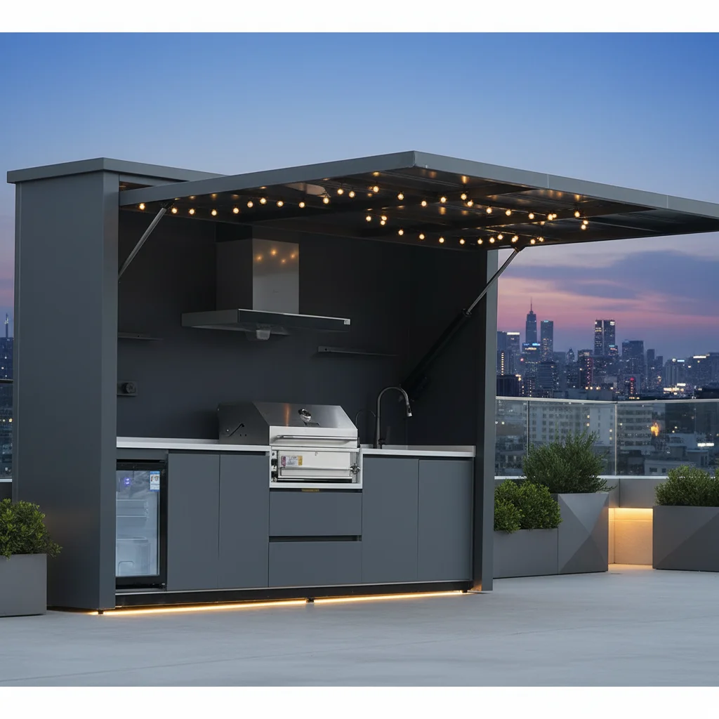 An outdoor kitchen extends living space beyond the home, combining cooking, dining, and entertainment in one functional area. Designed with integrated appliances such as a grill, sink, refrigerator, storage cabinets, and optional induction or gas cooktops.