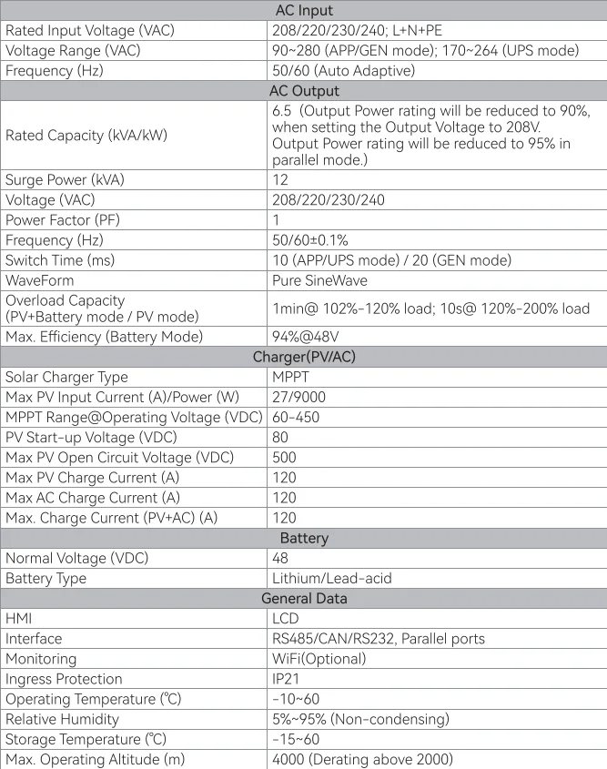 1. Rated power 6.5kW/6.5kVA, power factor 1