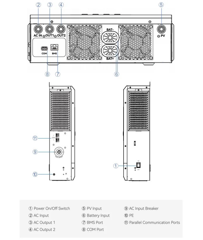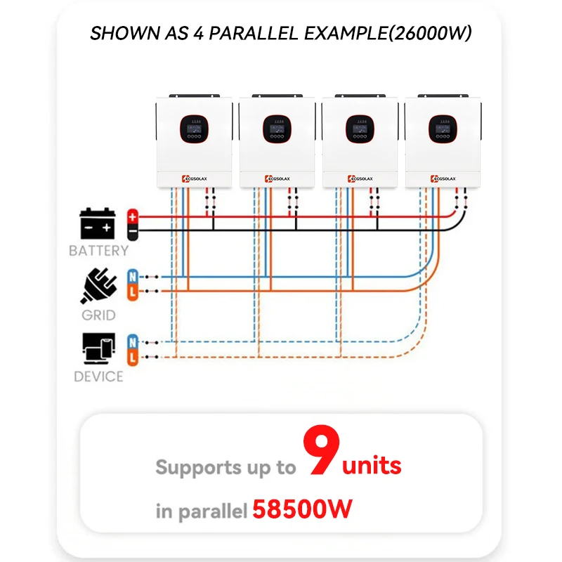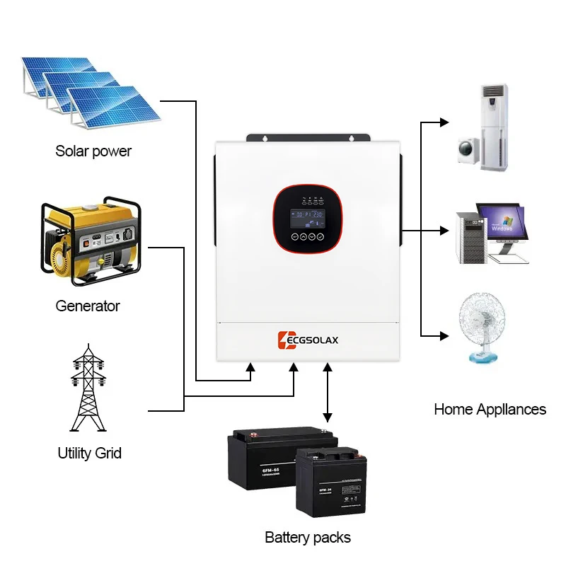 This is a multifunctional solar inverter, integrated with a MPPT solar charge controller, a high frequency pure sine wave inverter and a UPs function module in one machine, which is perfect for off grid backup power and self-consumption applications. This inverter can work with or withoutbatteries.