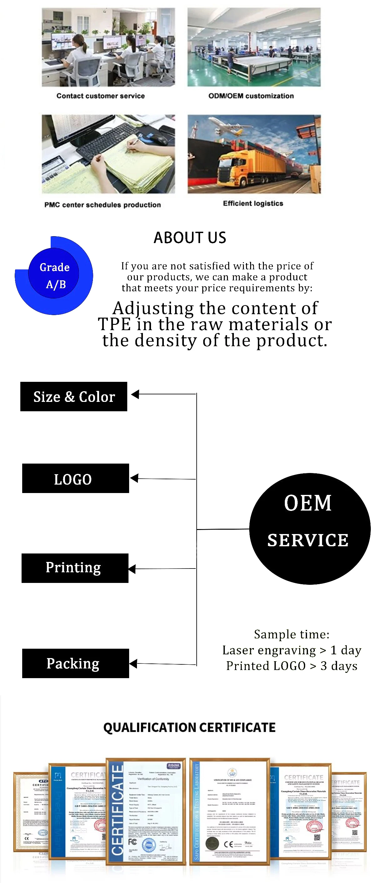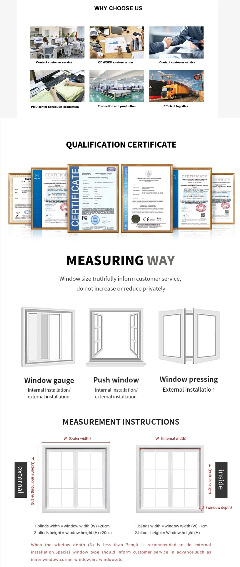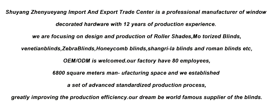 1.Q: Are you manufacturer or trade company? A:We are a professional manufacturer of window decorated hardware with 12 years of production experience 2.Q: Where is you factory located? How can I vist there? A: Our factory is located in Shuyang, Jiangsu Province ,China, near to HuaiAn Lianshui Airport, Welcome to our factory. 3.Q: How about the production time? A: Sample production time 1-2 days, mass production time: 3-7days. 4.Q: How much is the shipping cost? A: It depends on the weight and packing size and your area. 5.Q: Can you accept OEM or ODM? A: Yes, we can make OEM /ODM products according to your request. 6.Q: How about the MOQ? A: Our MOQ is 1 square meter. 7.Q: What’s your advantage? A: (1) Competitive price and Quality assurance (2) Professional manufacturer and Design team (3) 12 Years of production Experience (4) Short Delivery time (5) Prompt Reply and professional suggestion on all inquiries (6) 100% inspection one by one