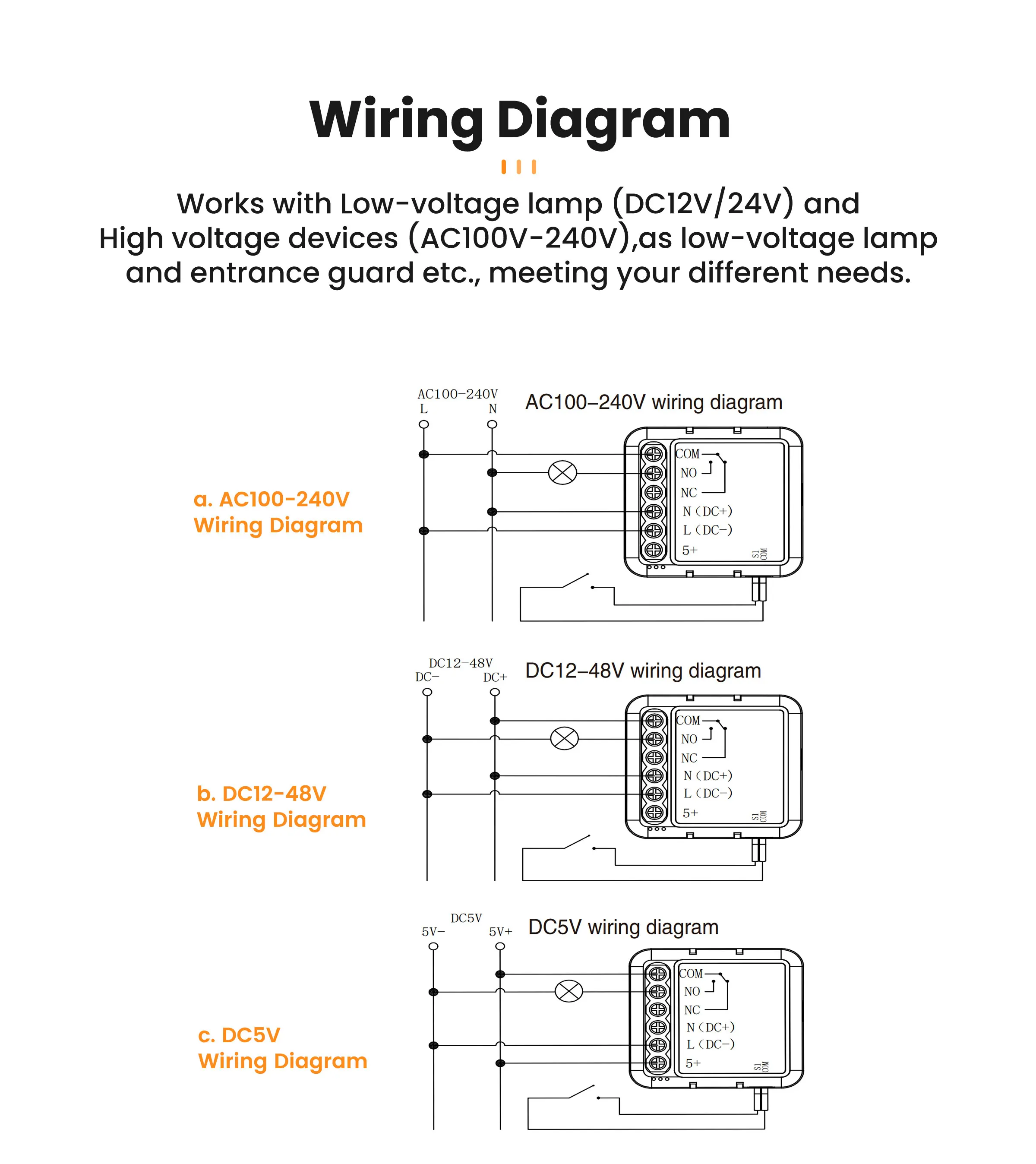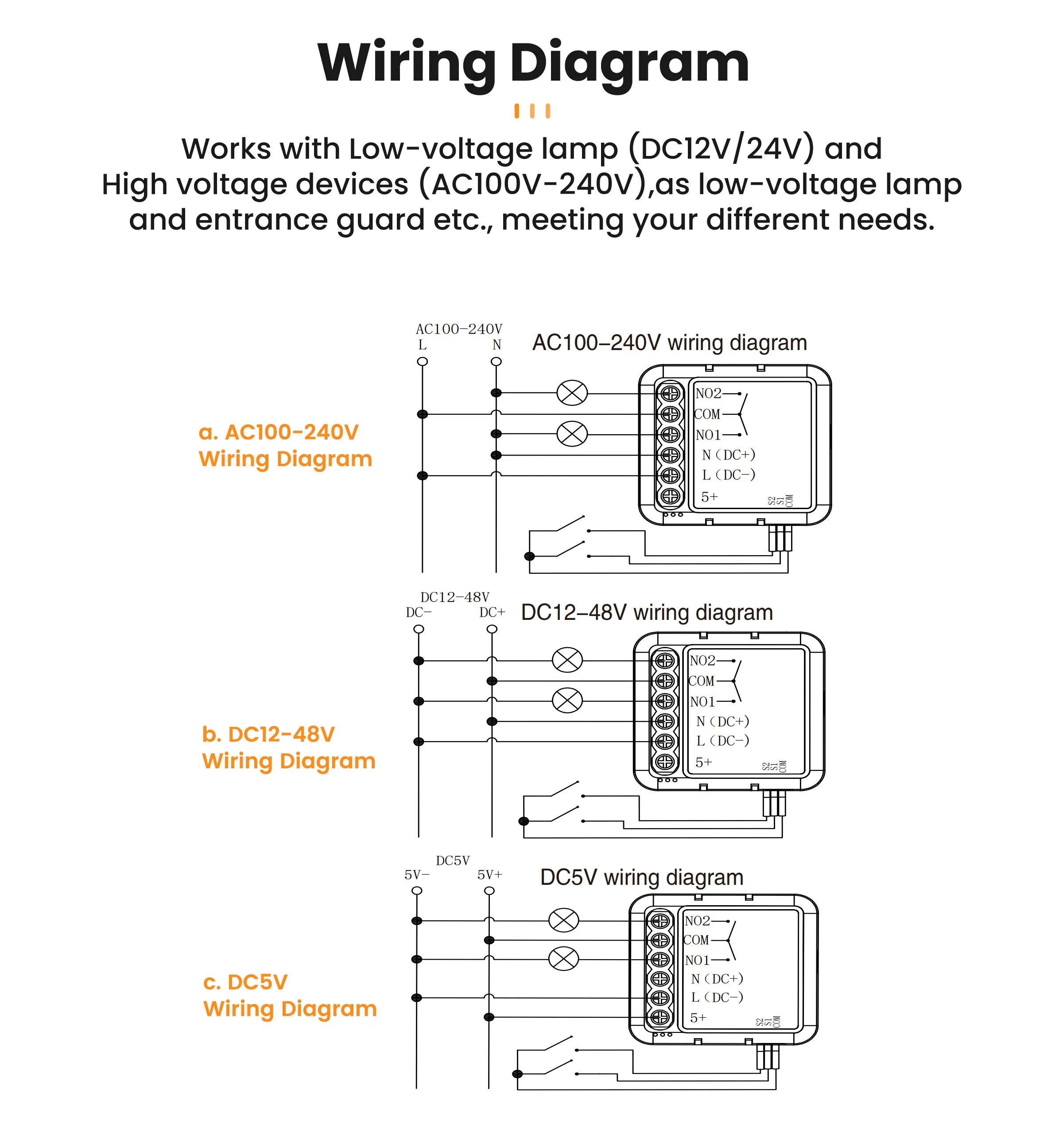 - Voltage: AC100-240V50/60Hz DC5V,12-48V