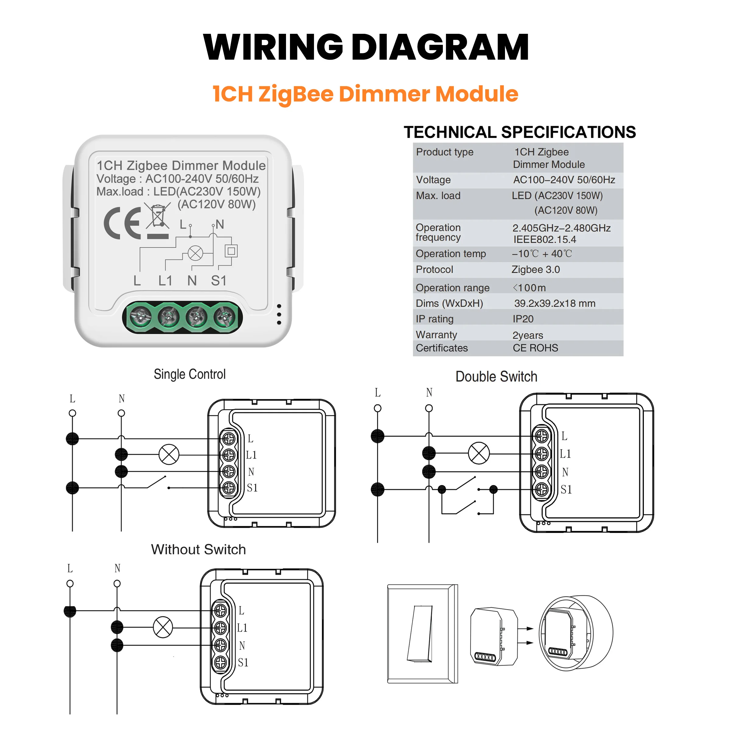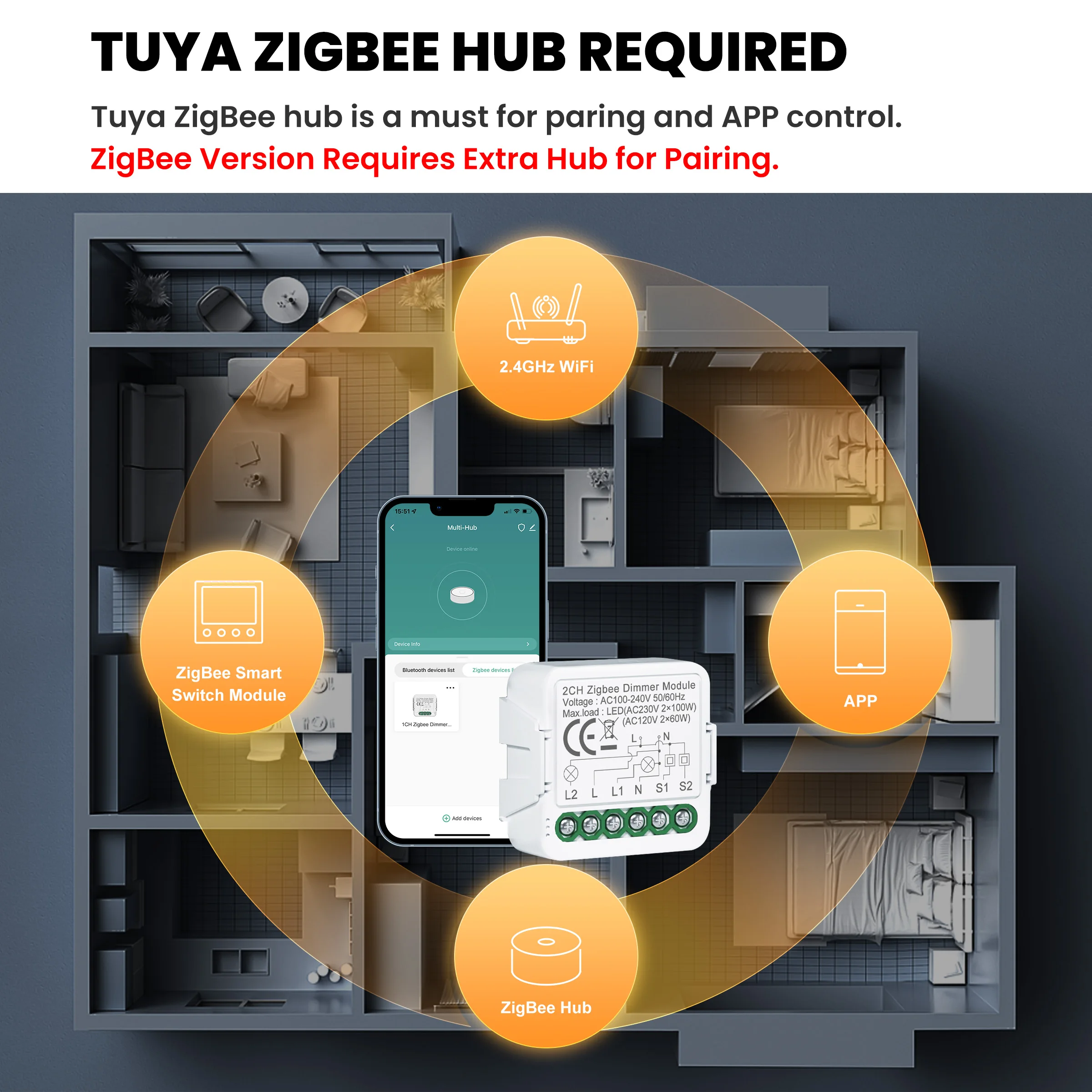 – The Zigbee switch module requires a Tuya Zigbee Hub for app and voice control when you choose ZigBee dimmer switch module. The hub also lets you connect it with other Zigbee devices to build a complete smart home system. Without the hub, it can only be controlled manually.