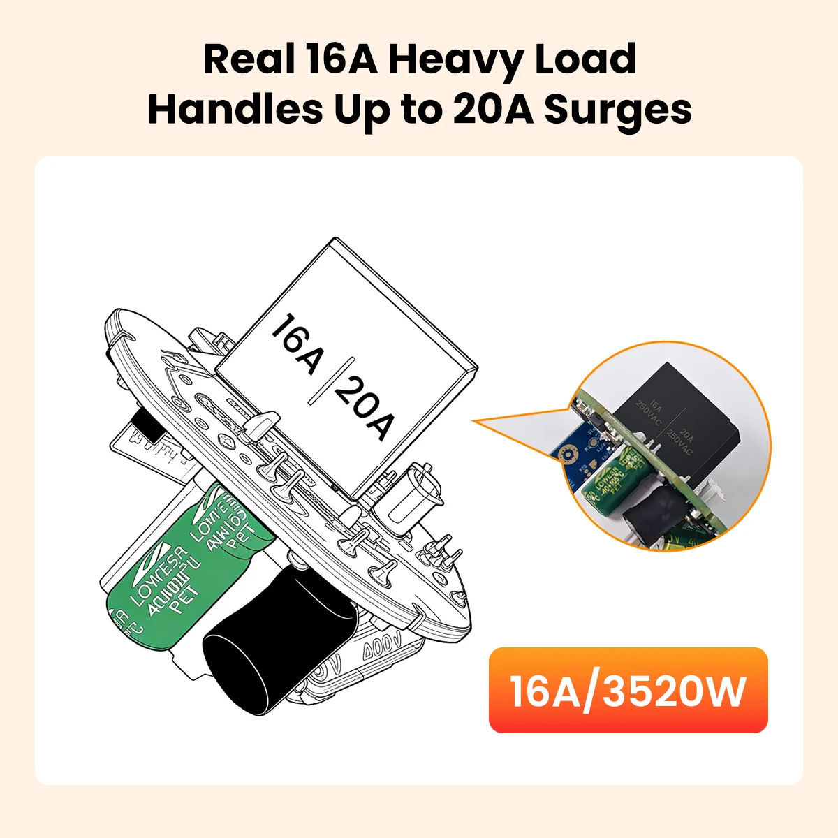 It features a 2x thickened steady pcb, pure copper safe pins, and branded premium components, while its housing is crafted with precision ultrasonic welding and v0 flame-retardant material, supporting a 16a stable load and up to 20a surge capacity for long-lasting reliability.
