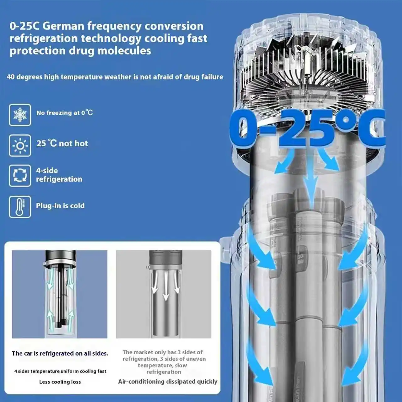 Equipped with German constant temperature cooling technology, the device provides fast and stable refrigeration from 0–25°C, protecting insulin and other temperature-sensitive medicines from heat damage. The intelligent digital LED display allows real-time temperature monitoring, giving users peace of mind during long