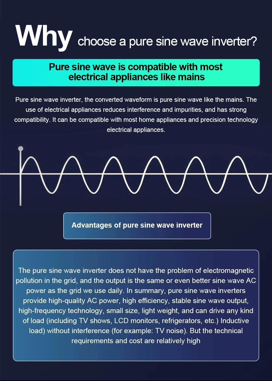 3. If you want to run the inductive load for a long time, choose the  Pure sine wave inverter .