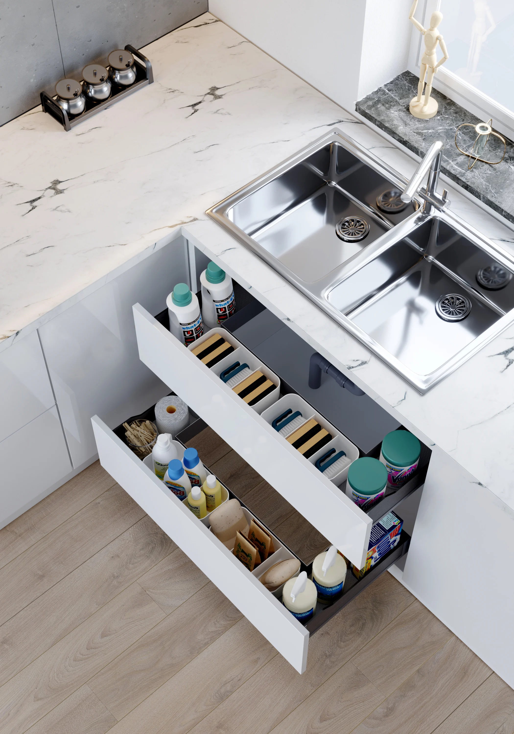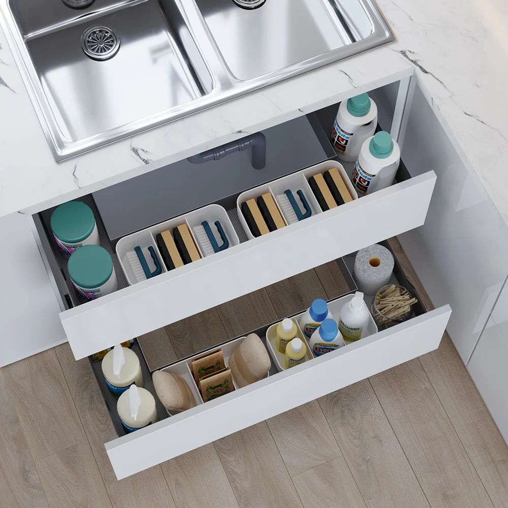 How to use the space under sink? Goldmine recommends this special drawer basket. With 2pcs PP storage boxes inside, you can store sanitary wares and detergent bottles into the drawer. Goldmine drawers are made of coated sheet + compact laminated side boards, 100% rust-proof, water-proof, deformation resist, and easy clean.