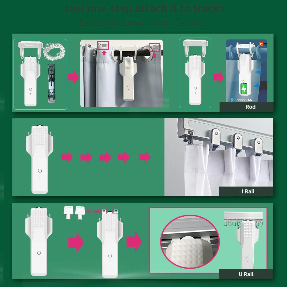 4. The new version of the motor is suitable for Roman rod, I track, U track, etc., which can be used directly on the pulley of the track, without worrying about the problem that the track is too small to put into it
