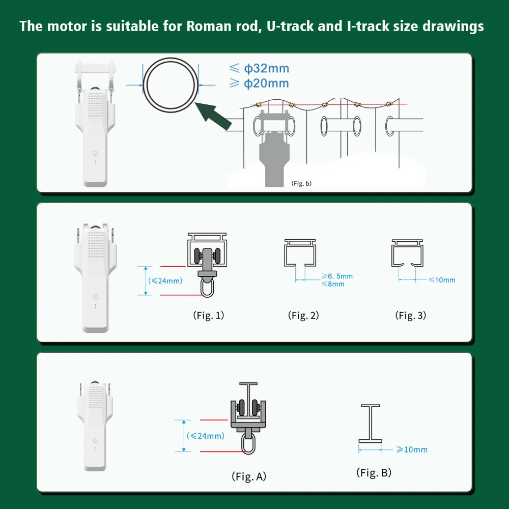 The following figure shows the dimensions of the new version of the motor, such as Roman rod, I rail, U rail, etc. Please check that your track is in the following size range before ordering, so as not to be out of use