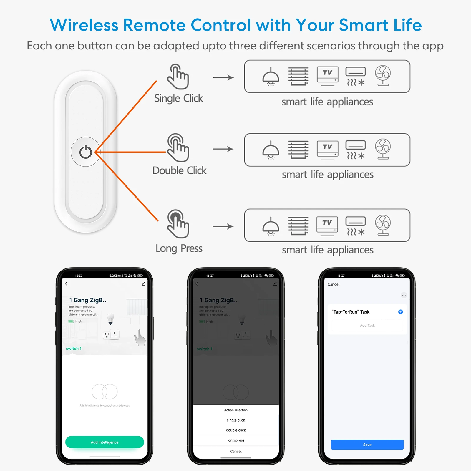 – With this 1 Gang Tuya ZigBee remote, you can define up to 3 commands in the Smart Life App.