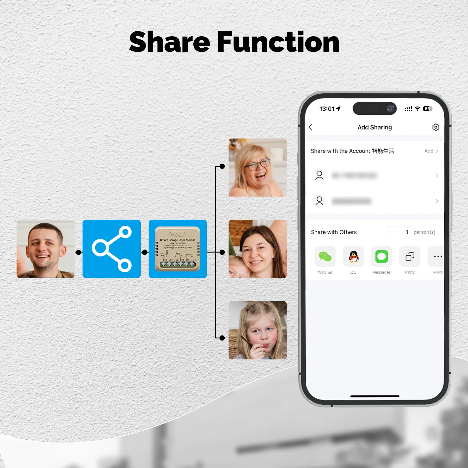 Share the operation permissions of smart garage door module to your family,enjoying smart and convenient life together.