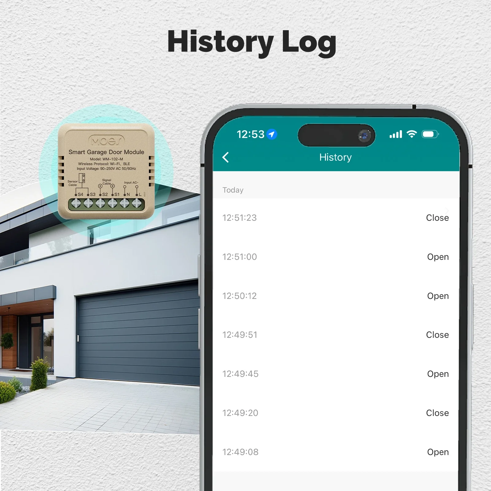 The opening or closing of the garage door will be automatically recorded, and you can view the history anytime in the app.