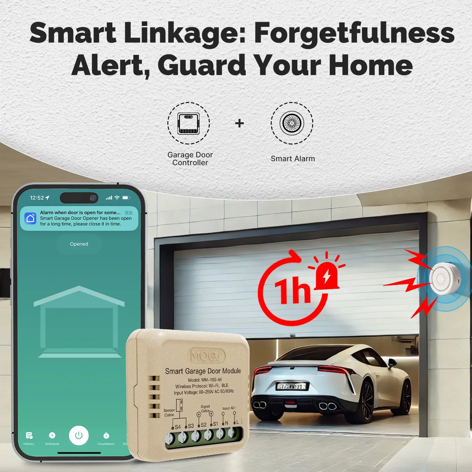 Link the garage door controller with the smart alarm by MOES App. When the garage door remains open for too long and triggers a phone notification, the alarm will also activate, providing double protection for your home and property.