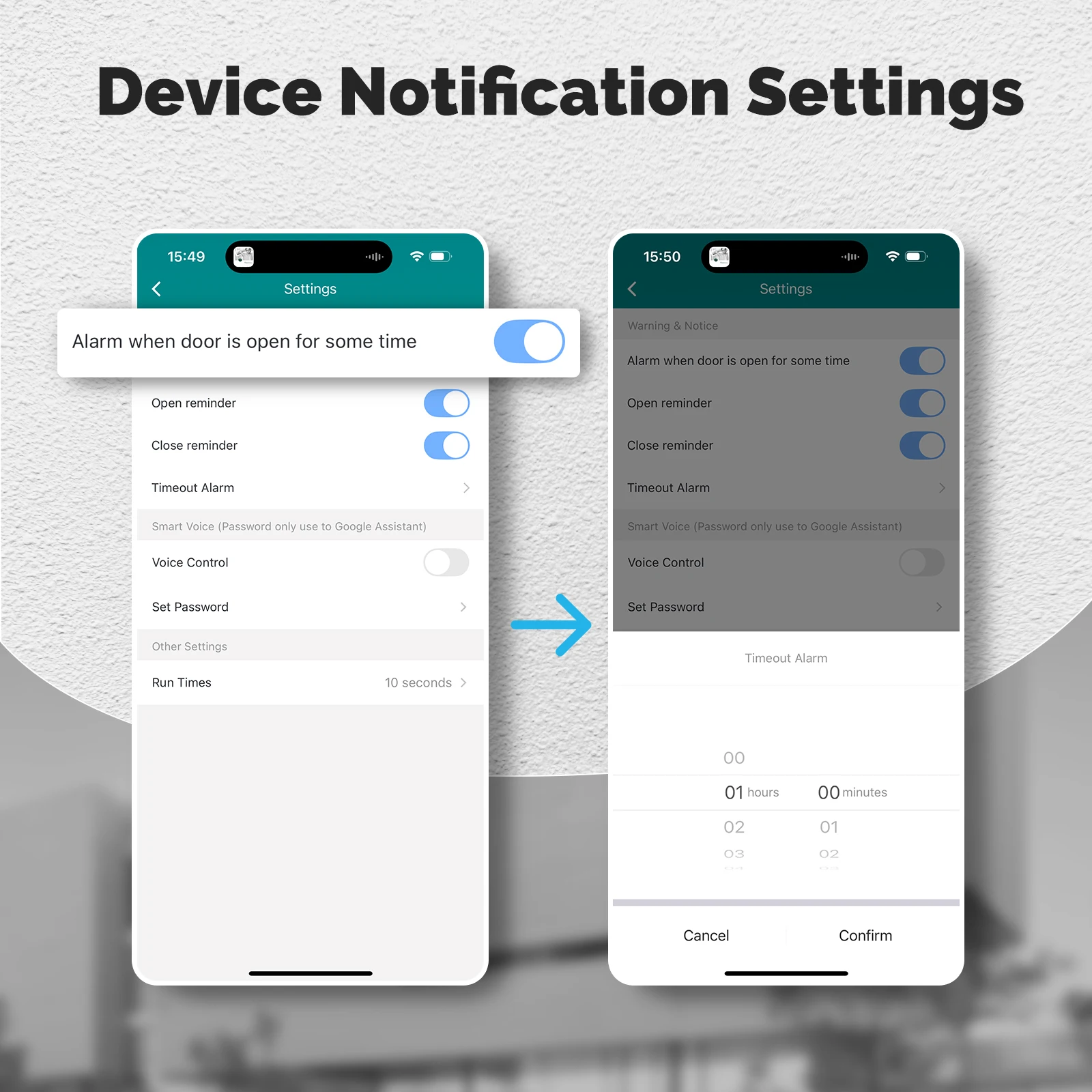 Based on your needs, you can enable/disable the following in the APP settings: door open notification, door close notification, and timeout alert. The timeout alert time can be customized. You can also create custom scenes for it.