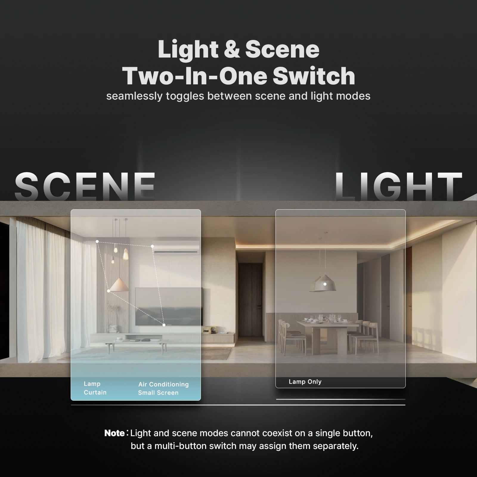 Note:Light and scene mode cannot coexist on a single button,but a multi-button switch may assign them separately.