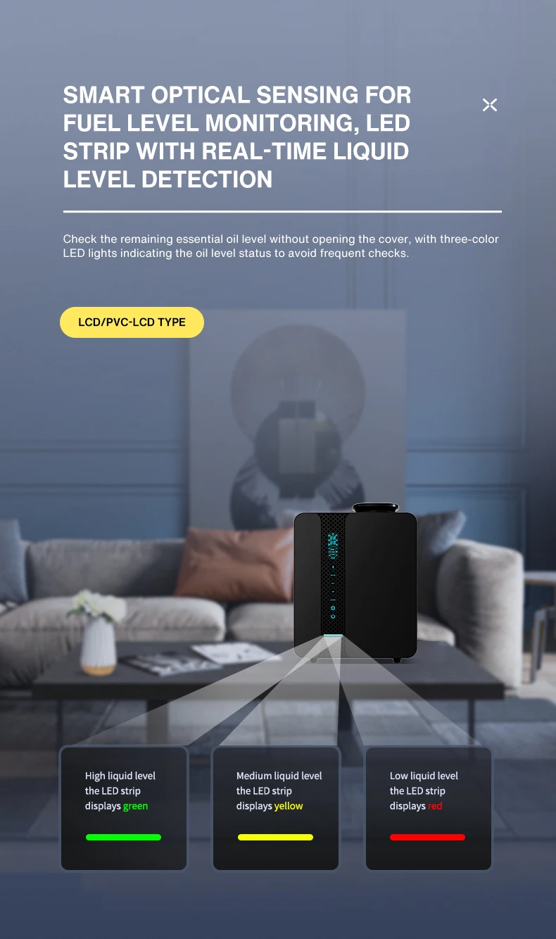 Check the remaining essential oil level without opening the cover, with three-color LED lights indicating the oil level status to avoid frequent checks