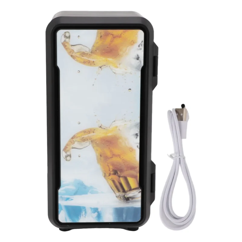 5.USB Interface Power: This small refrigerator is powered by a USB interface and can be used only when connected to a computer, power bank or other compatible devices, which is easy to carry and use without additional power outlets, suitable for office, travel or outdoor use.