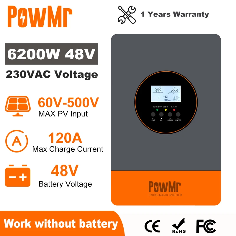 PowMr 6.2KW Hybrid Solar Inverter 48V 220V Off grid Inverter With MPPT 120A Charger Work Without Battery Parallel Up to 9 Units