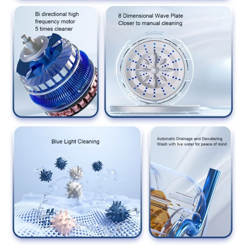 3.POWERFUL CLEANING PERFORMANCE: Offers comprehensive hand wash simulation with strong dirt removal. Equipped with blue light for cleaning small items like baby clothes, underwear, or socks (not for large items).