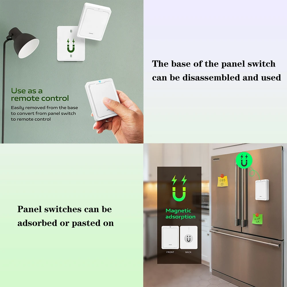 2. The panel switch is attached with a base, which can be disassembled and has an adsorption function. It can be adsorbed on magnets or pasted on the wall, which is simple and convenient.