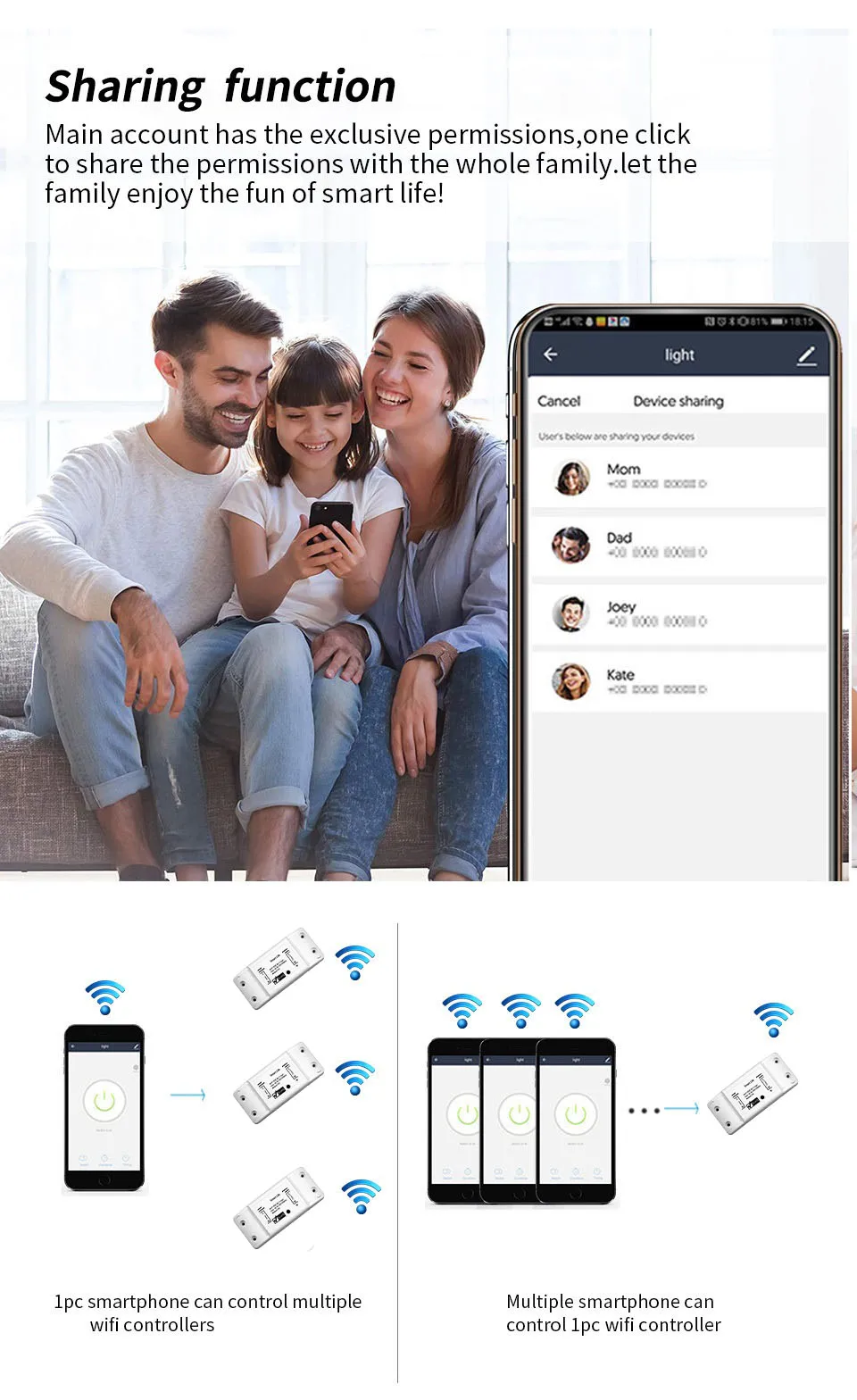 4. Share Device:This samrt switch can have several control sites shared by different family members.one mobile phone can control many switches also.