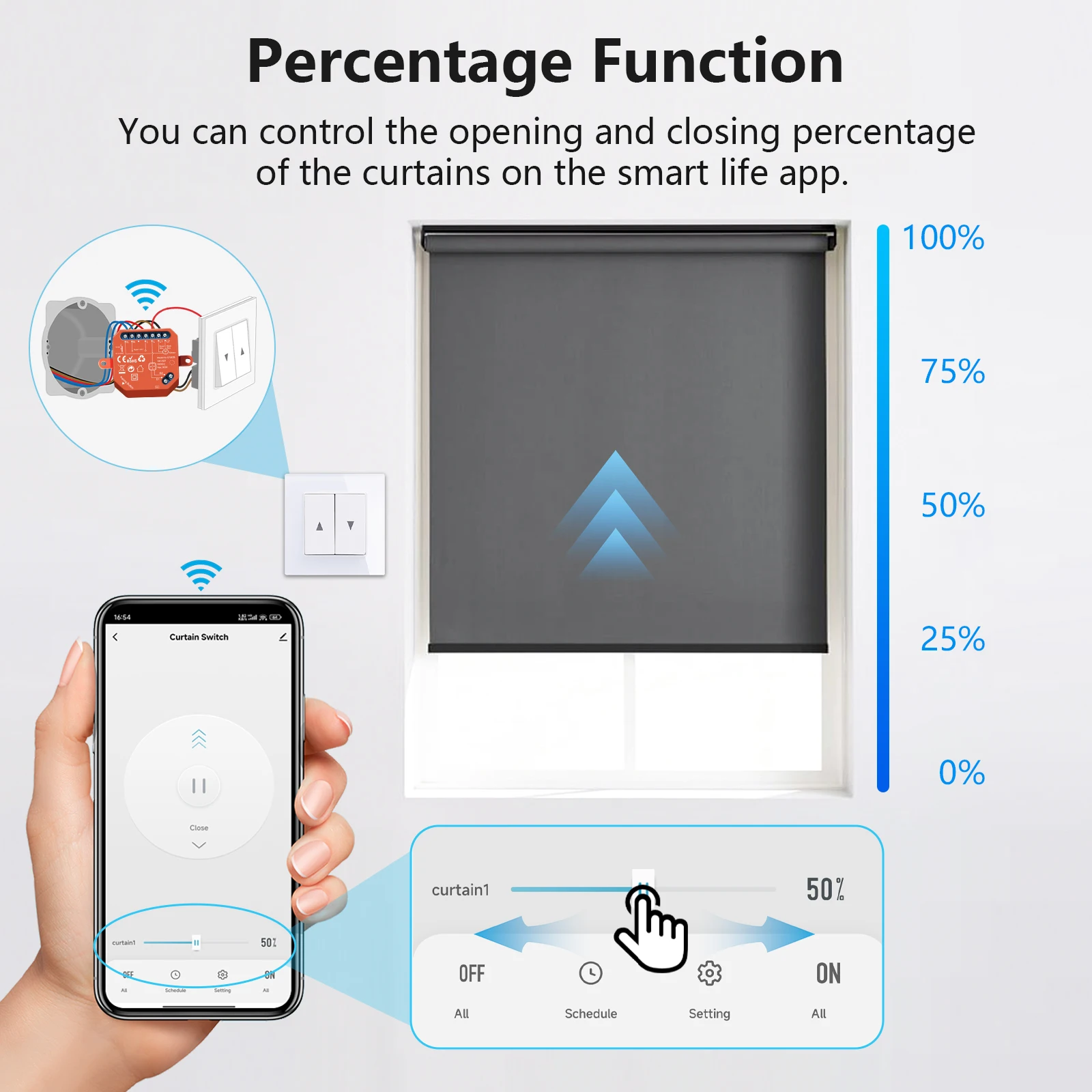 You can control the opening and closing percentage of the curtains on the smart life app.
